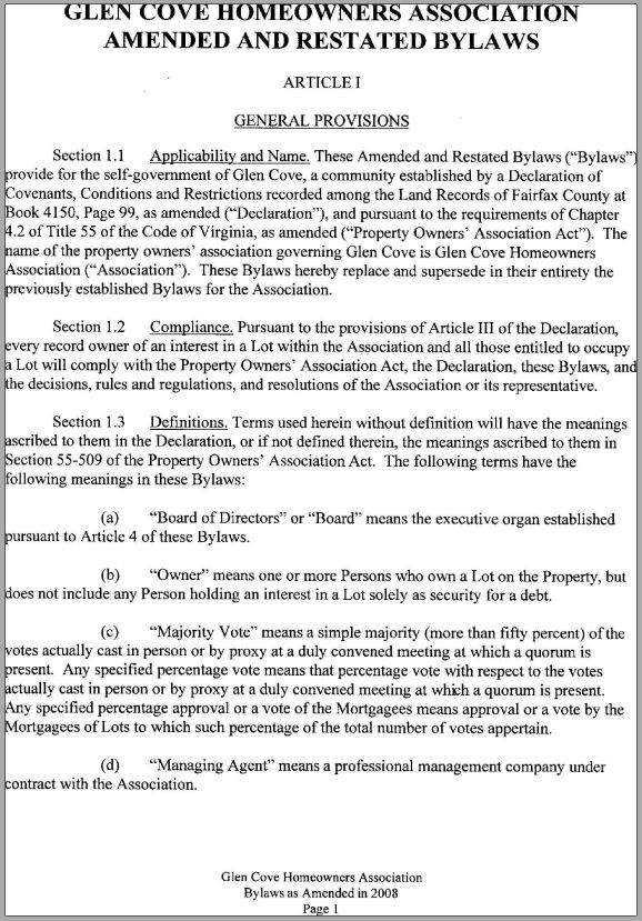 As a homeowners association in the Commonwealth of Virginia, the Glen Cove Homeowners Association (GCHOA) is governed according to the Virginia Property Owners Association Act and the GCHOA governing documents.